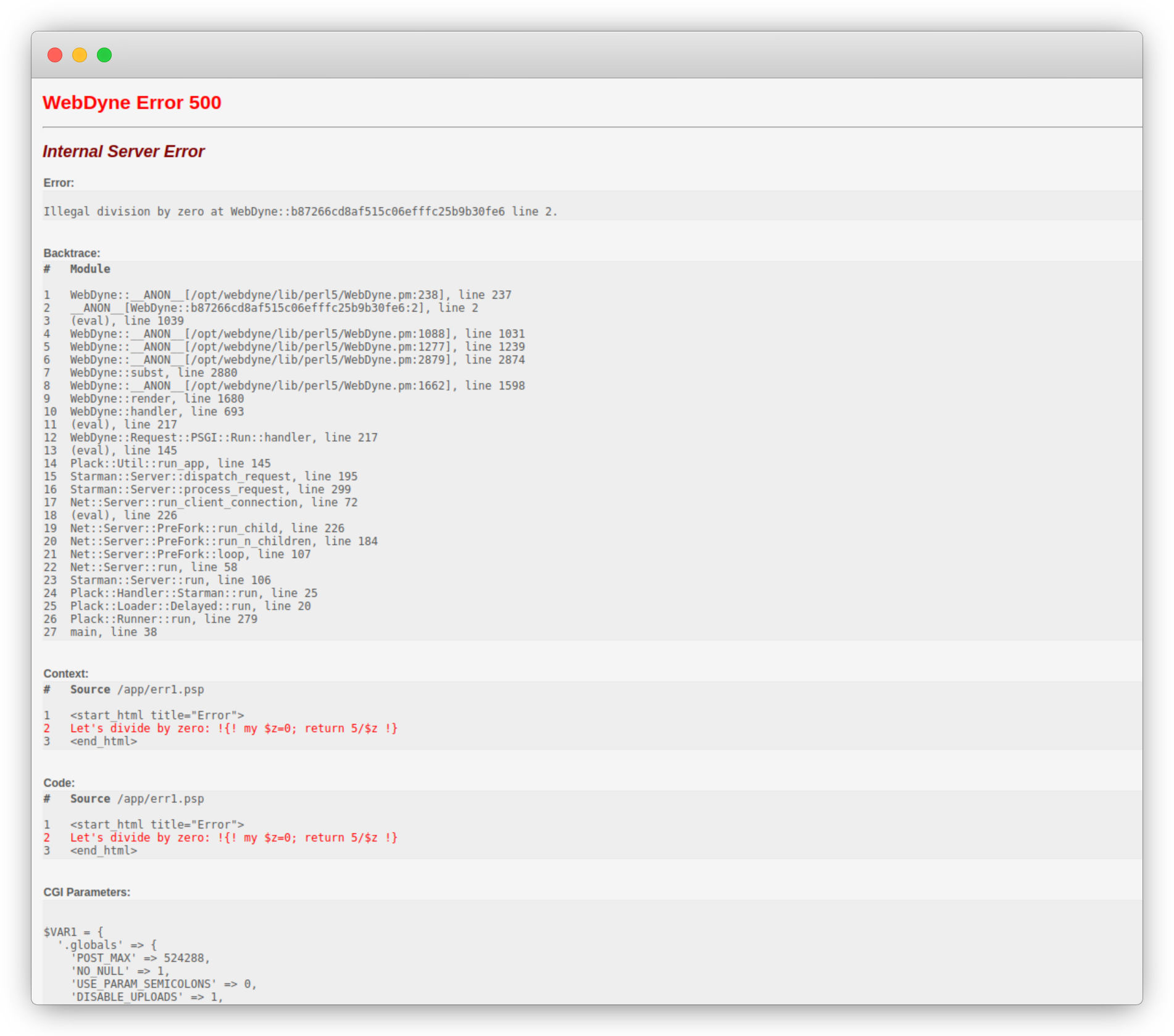 Sooner or later something is going to go wrong in your code. If this happens WebDyne will generate an error showing what the error was and attempting to give information on where it came from: Take the following example: